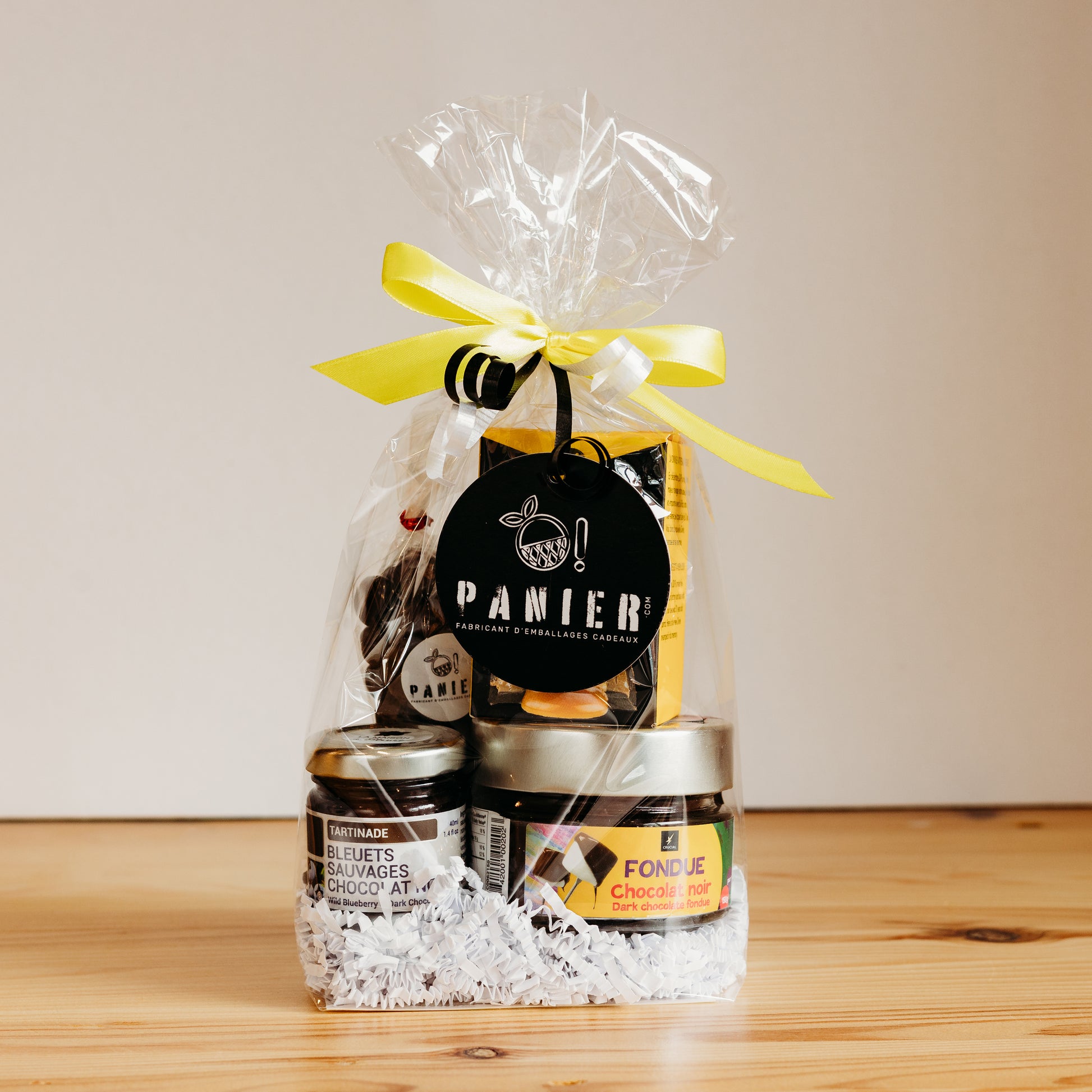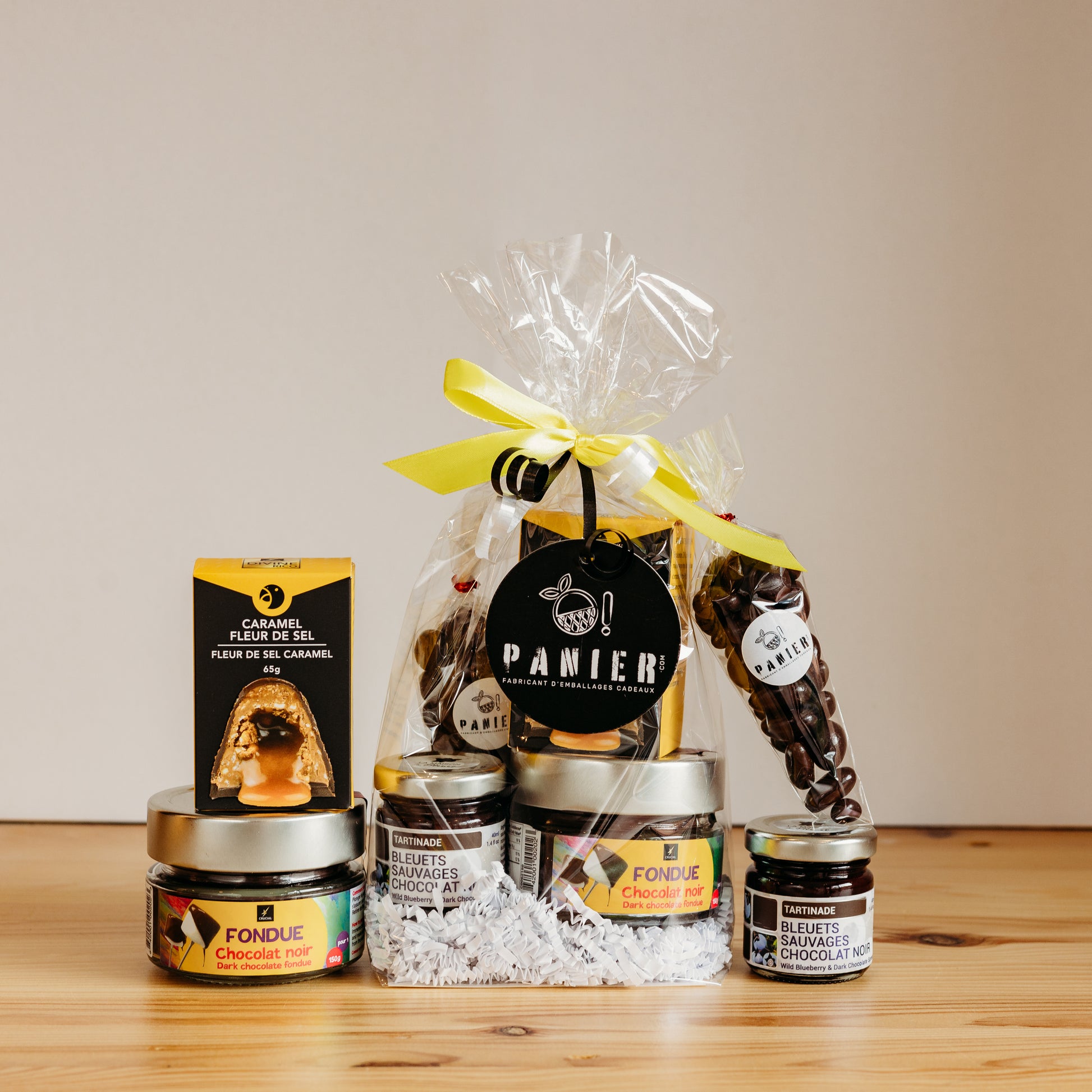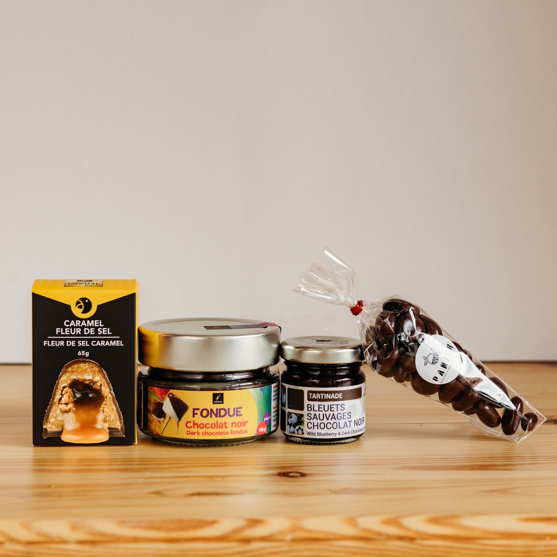 Plongez dans l'univers sucré du Baluchon O! Chocolats, une collection exquise conçue pour les amateurs de douceurs. Célébrez les saveurs riches et indulgentes avec notre sélection raffinée, allant de la fondue au chocolat onctueuse, parfaite pour une soirée gourmande, aux canneberges enrobées de chocolat noir, offrant une touche de raffinement fruité. Ajoutez à cela une tartinade de bleuets luxueuse et des créations chocolatées uniques pour une expérience chocolatée inoubliable.