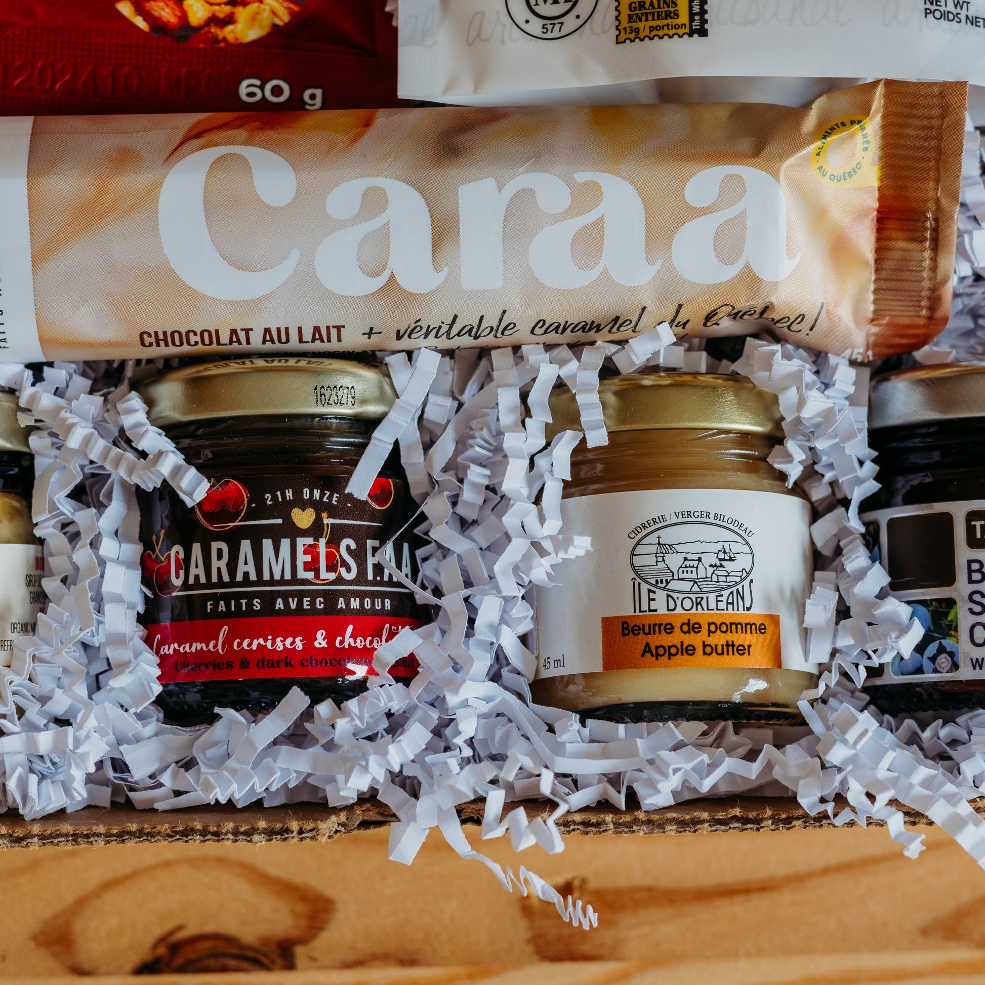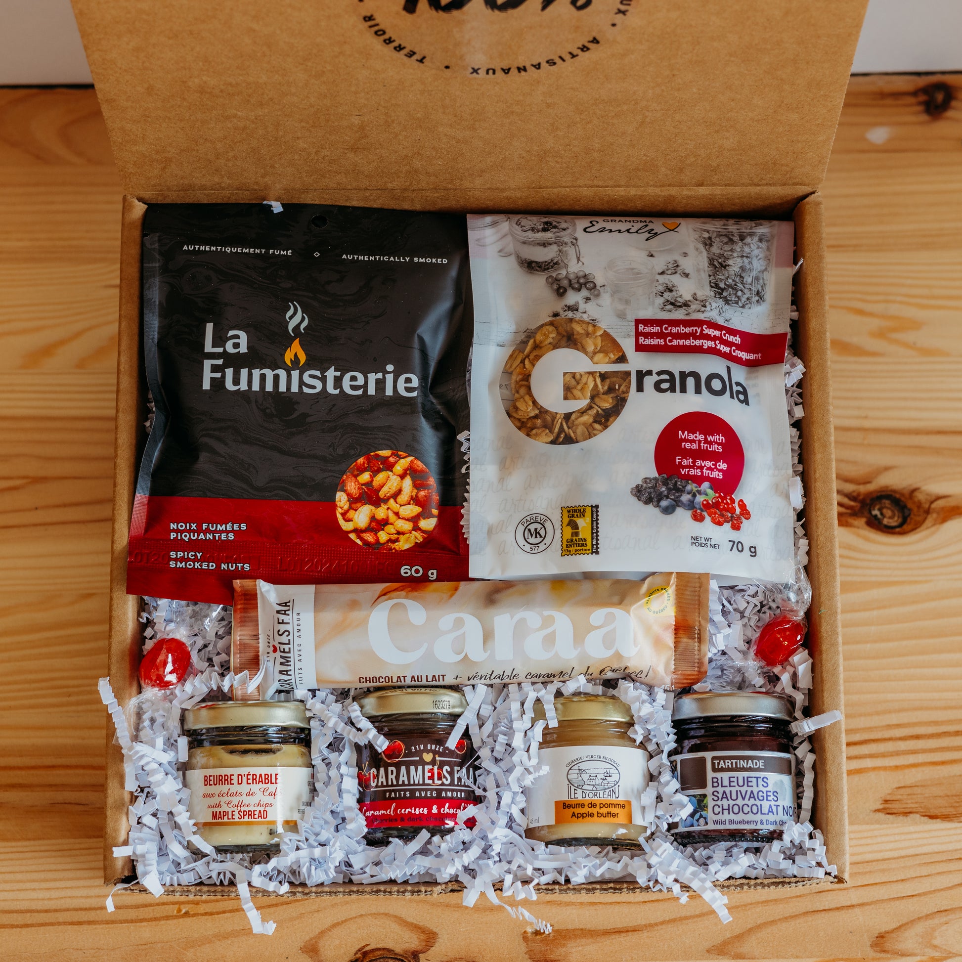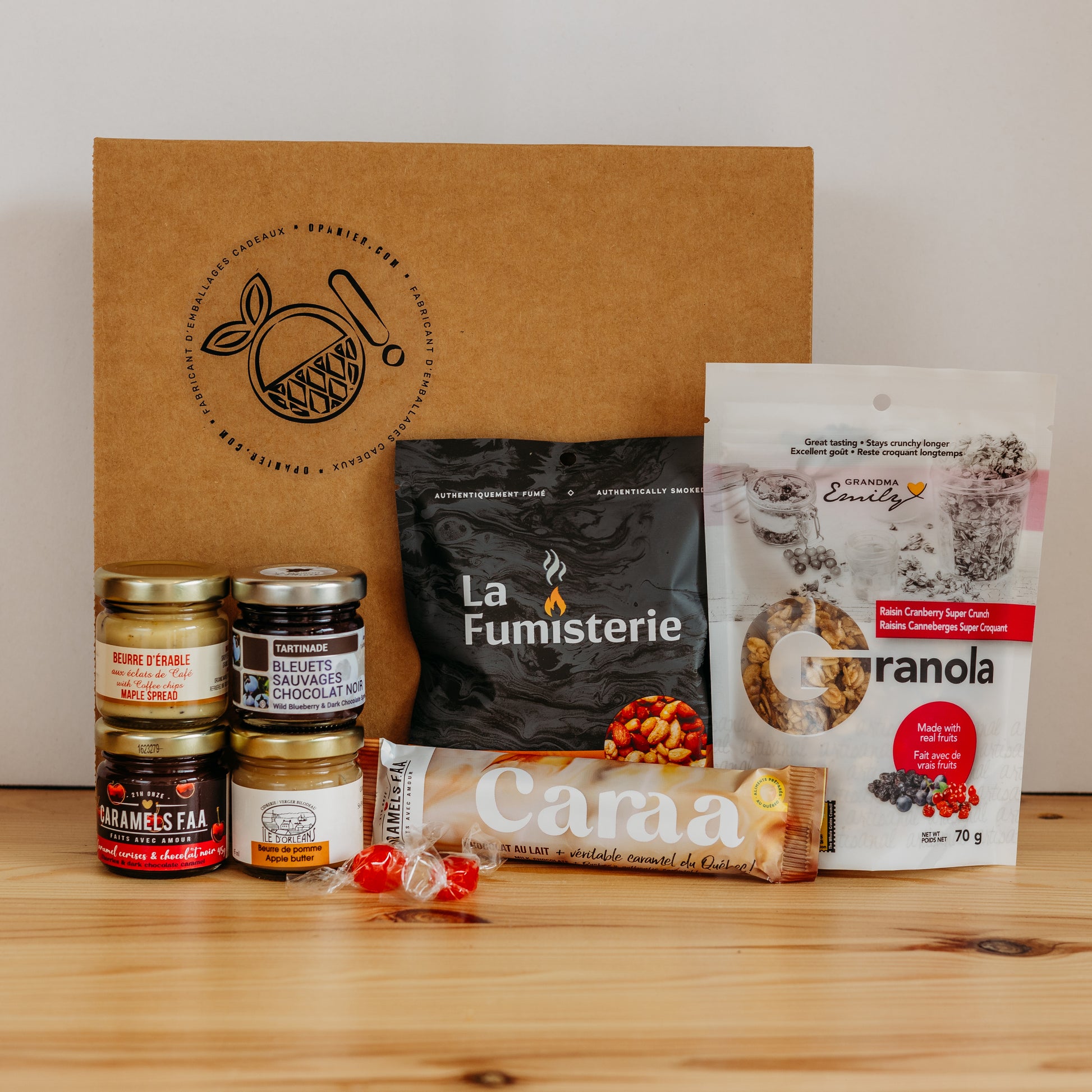 Offrez vous un début de journée délectable avec notre Boîte O! Douceurs Matinales, une sélection exquise de gourmandises sucrées. Cette boîte regroupe des pacanes à l'érable avec éclats de café et un granola croustillant amande et vanille pour accompagner votre petit déjeuner ou votre pause café. Savourez des douceurs comme le fondant au sucre d'érable, un ensemble de deux chocolats fins, et une tartinade unique de chocolat aux figues et porto. Complétez votre expérience avec un caramel à l'érable onctueux, du miel enrichi de bleuets, et un beurre de pommes artisanal. Parfait pour les gourmets souhaitant ajouter une touche de luxe à leur routine matinale.