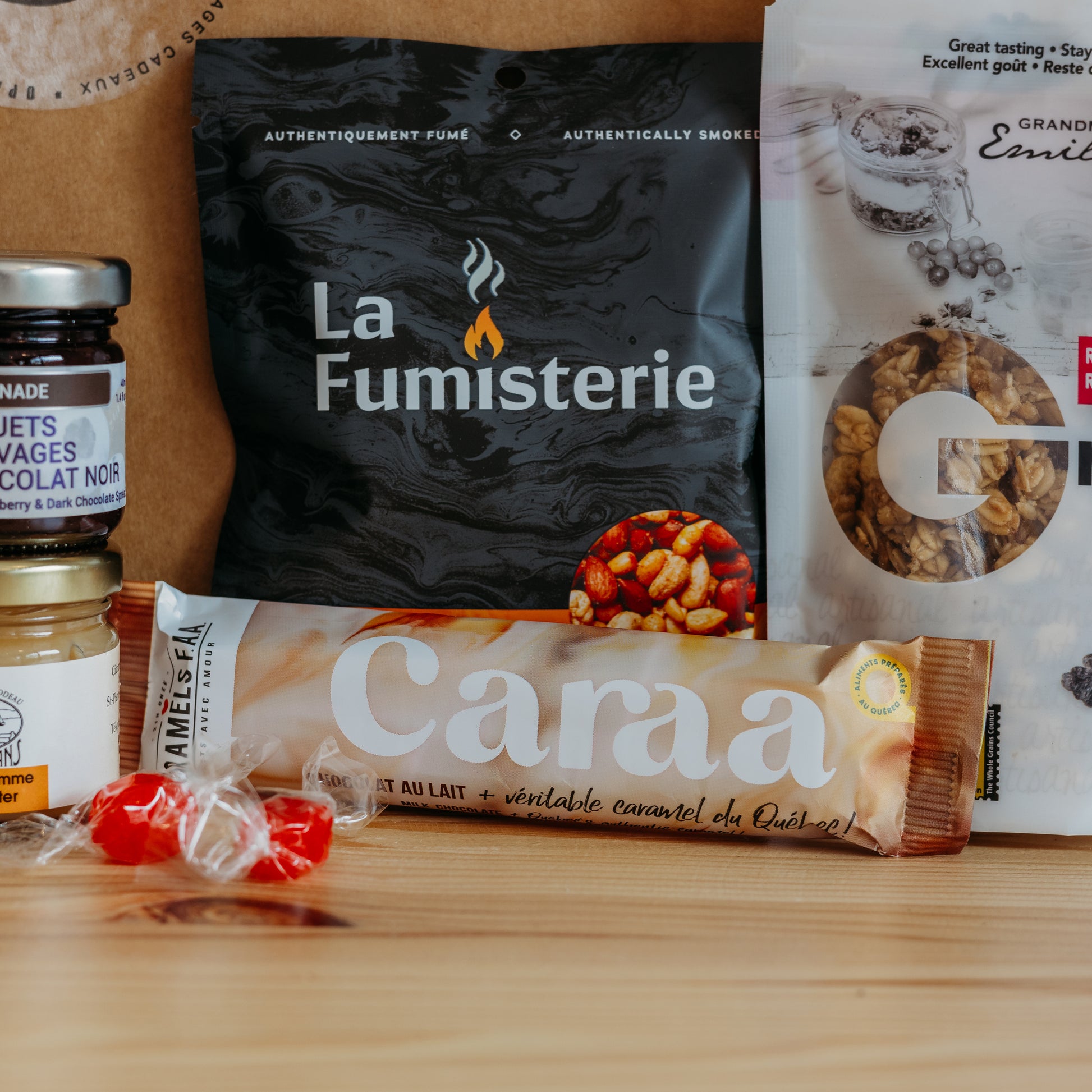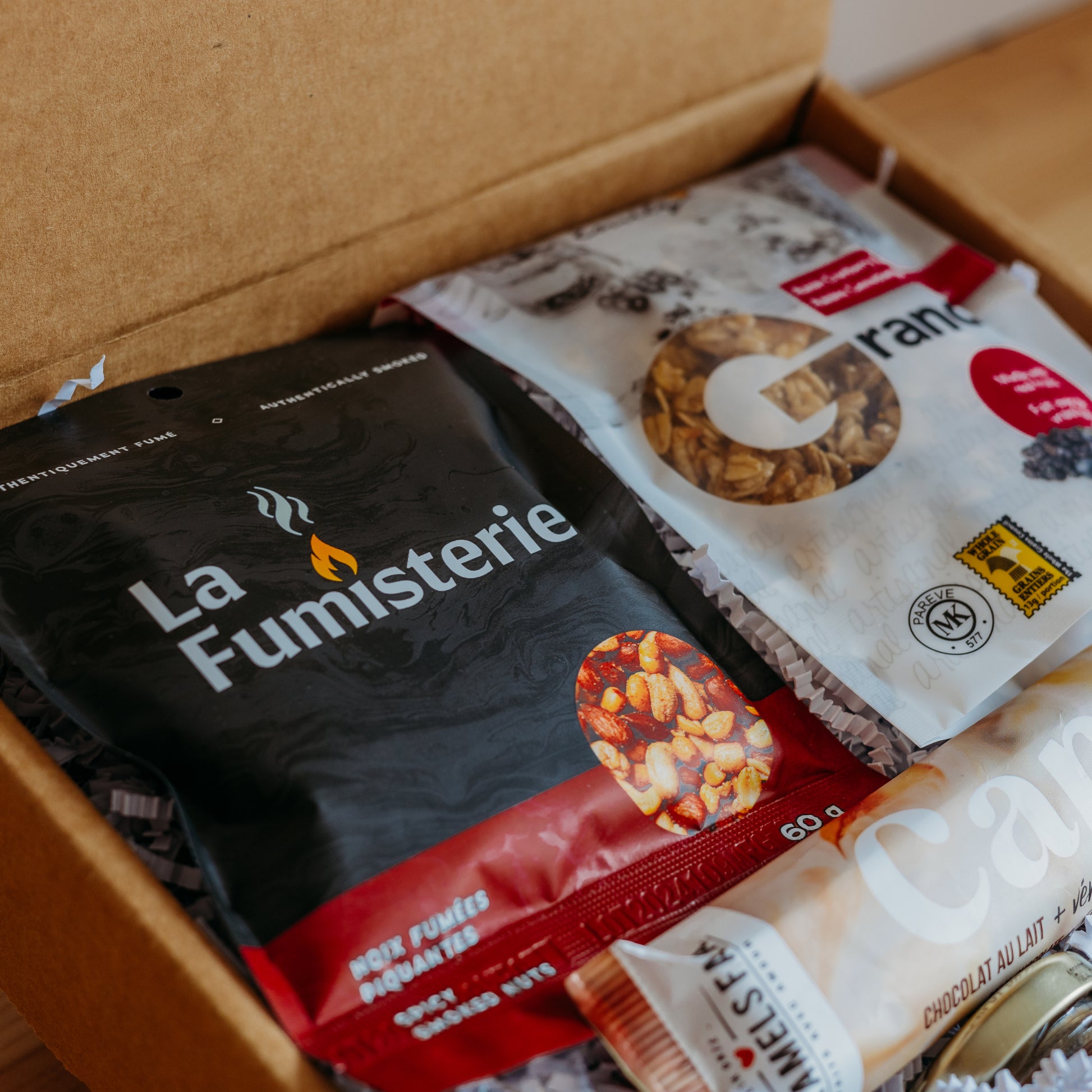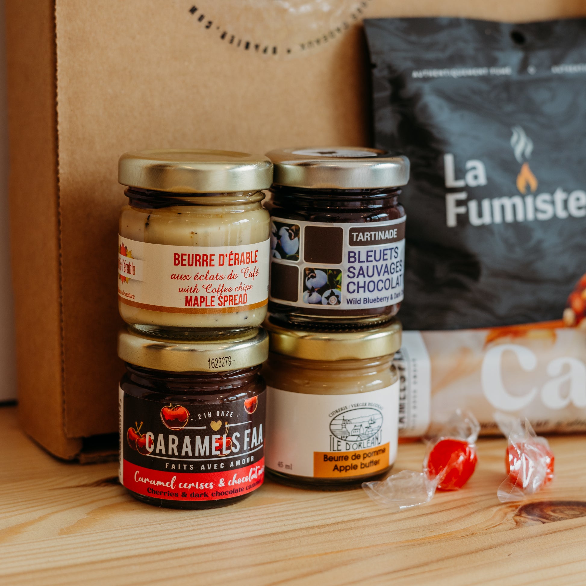 Offrez vous un début de journée délectable avec notre Boîte O! Douceurs Matinales, une sélection exquise de gourmandises sucrées. Cette boîte regroupe des pacanes à l'érable avec éclats de café et un granola croustillant amande et vanille pour accompagner votre petit déjeuner ou votre pause café. Savourez des douceurs comme le fondant au sucre d'érable, un ensemble de deux chocolats fins, et une tartinade unique de chocolat aux figues et porto. Complétez votre expérience avec un caramel à l'érable onctueux, du miel enrichi de bleuets, et un beurre de pommes artisanal. Parfait pour les gourmets souhaitant ajouter une touche de luxe à leur routine matinale.