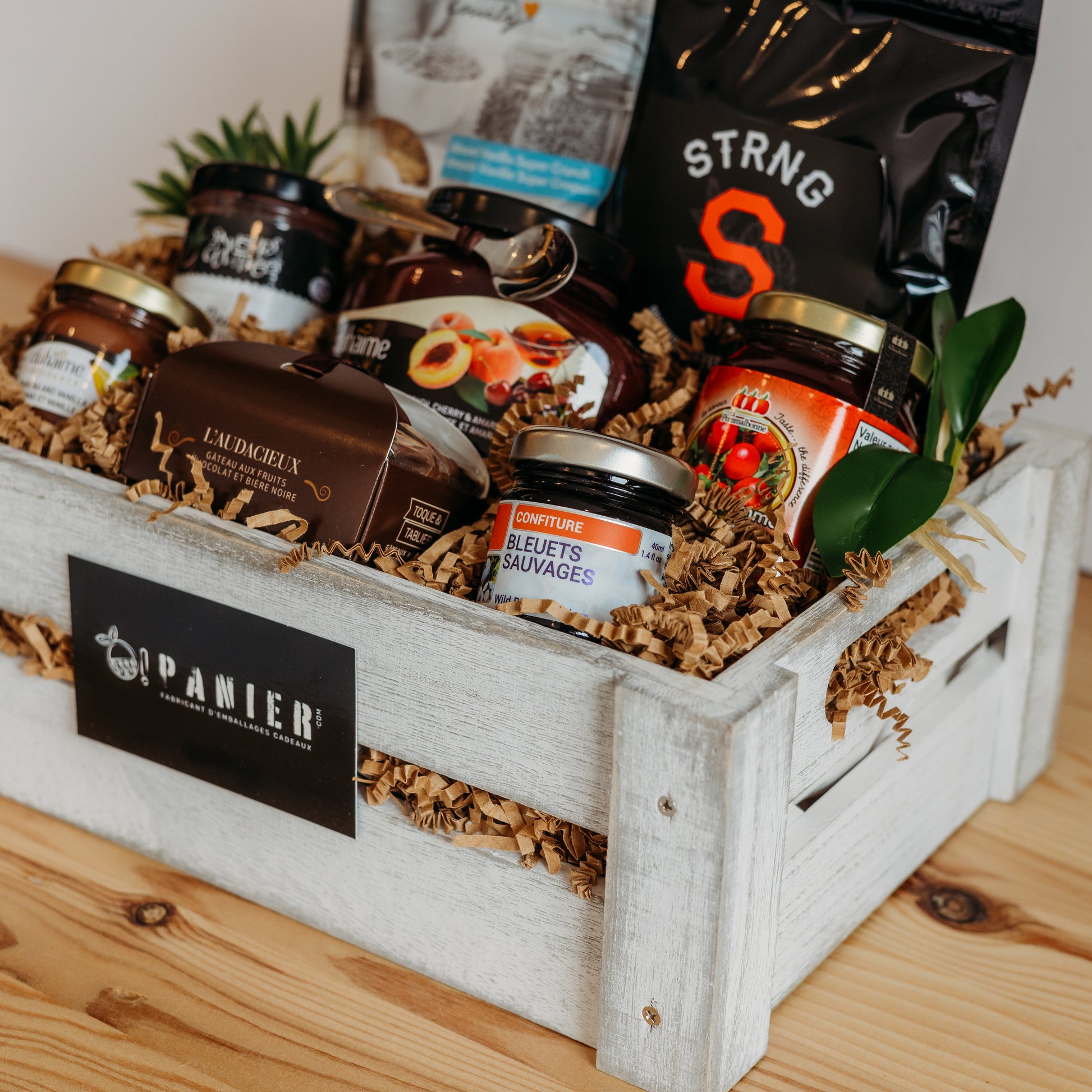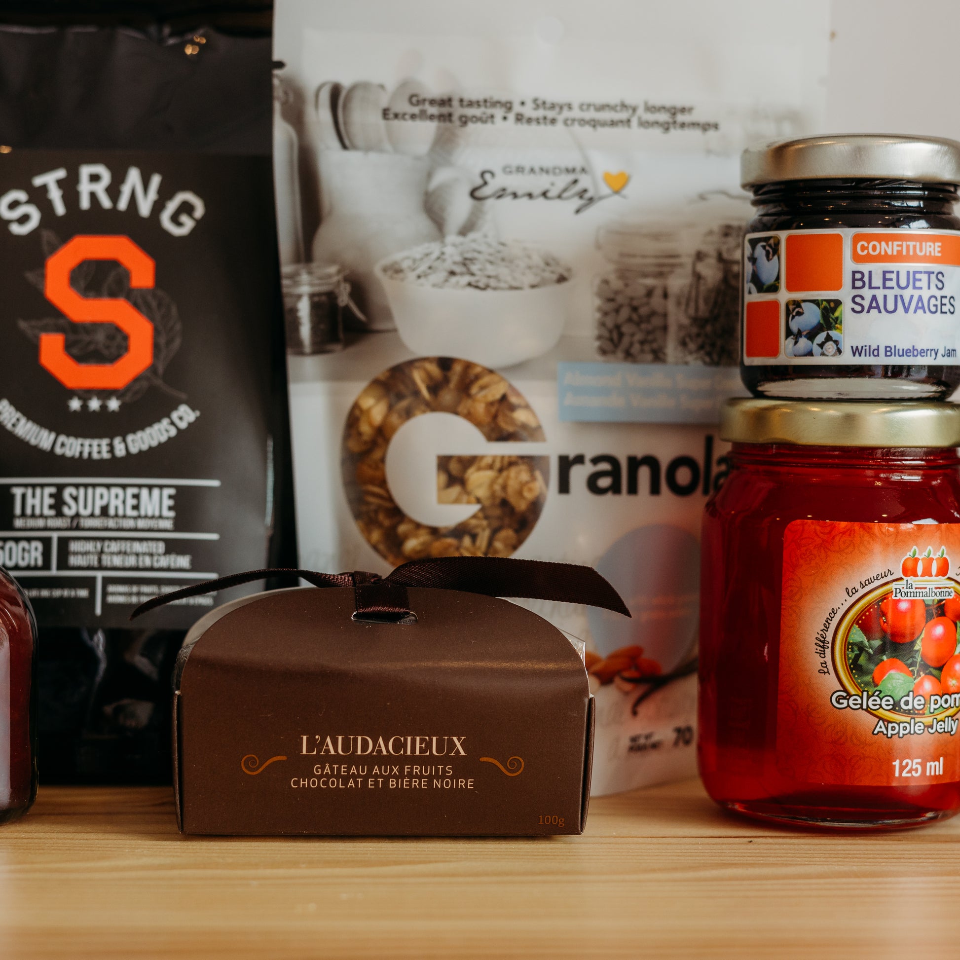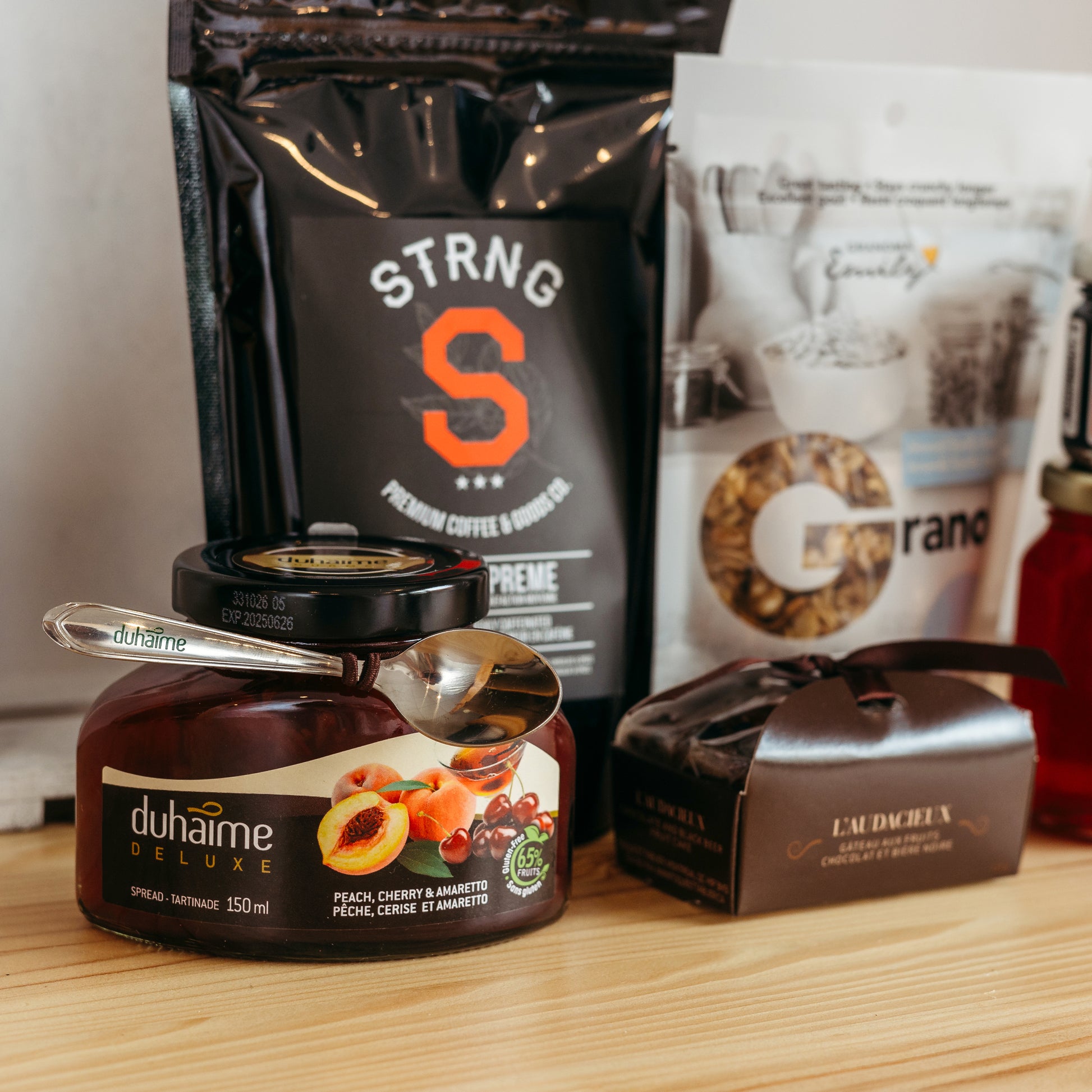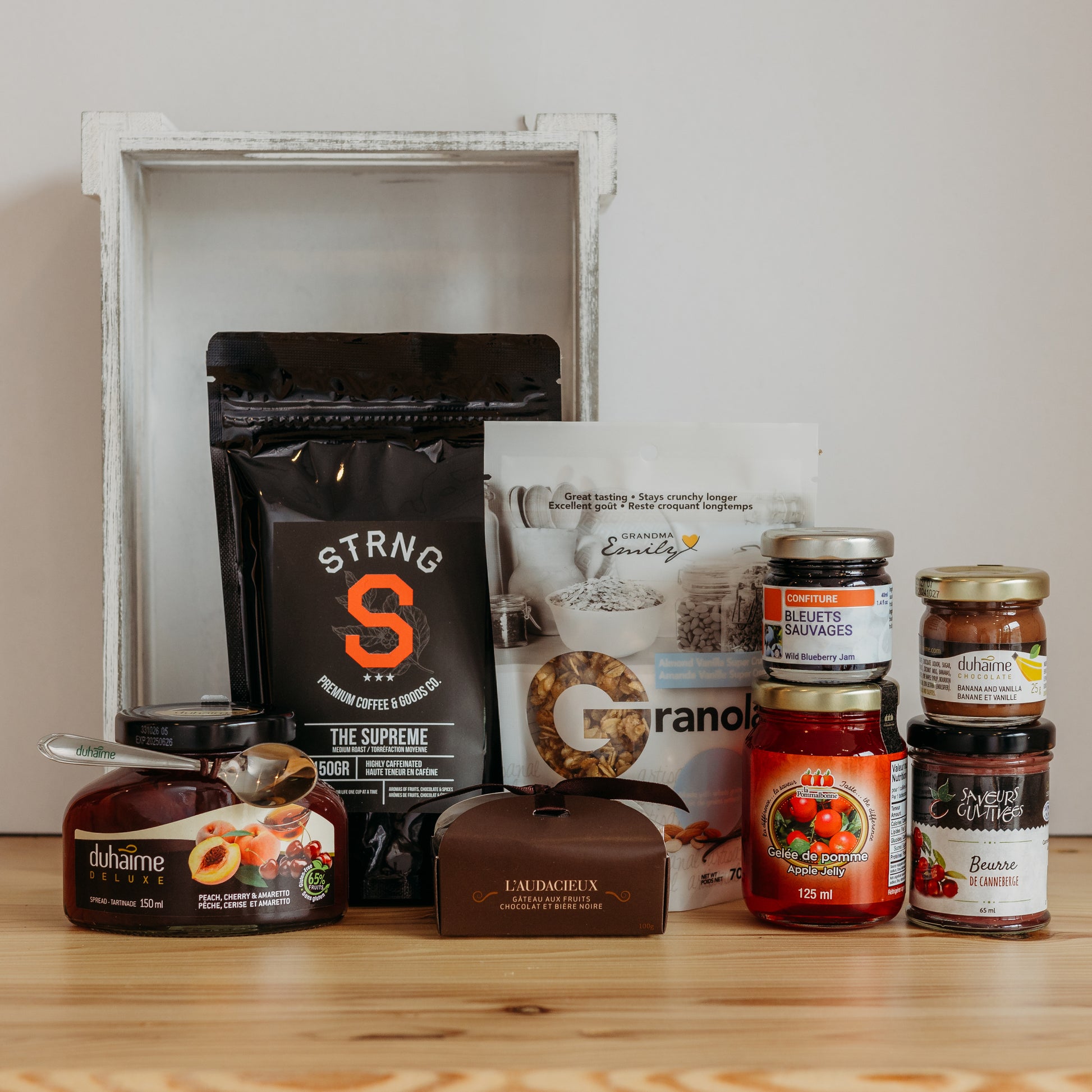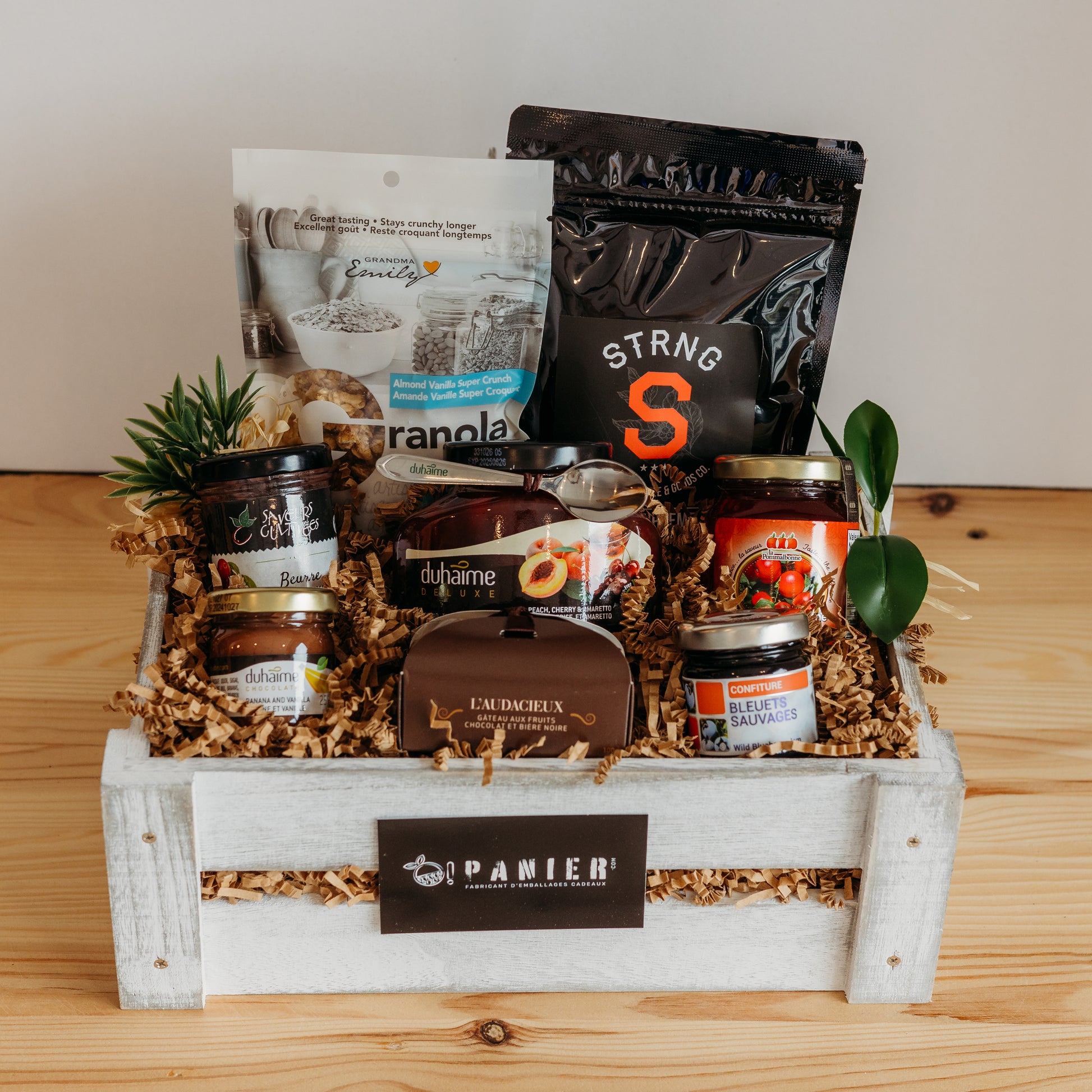 Commencez votre journée avec le Panier O! Bon Matin, une sélection délicieuse de produits matinaux pour éveiller vos sens. Ce panier combine des grains de café de haute qualité pour un réveil énergique, accompagnés de granola croustillant à la vanille pour une touche de douceur. Savourez des gelées et confitures artisanales, de pommes fraîches, de pêche à l'Amarreto, et de bleuets sauvages, parfaites sur vos toasts matinaux. Le beurre de canneberge que la tartinade banane et chocolat ajoutent une richesse gourmande à votre petit déjeuner. Le Panier O! Bon Matin est idéal pour ceux qui cherchent à enrichir leur première repas de la journée avec des saveurs authentiques et exquises.